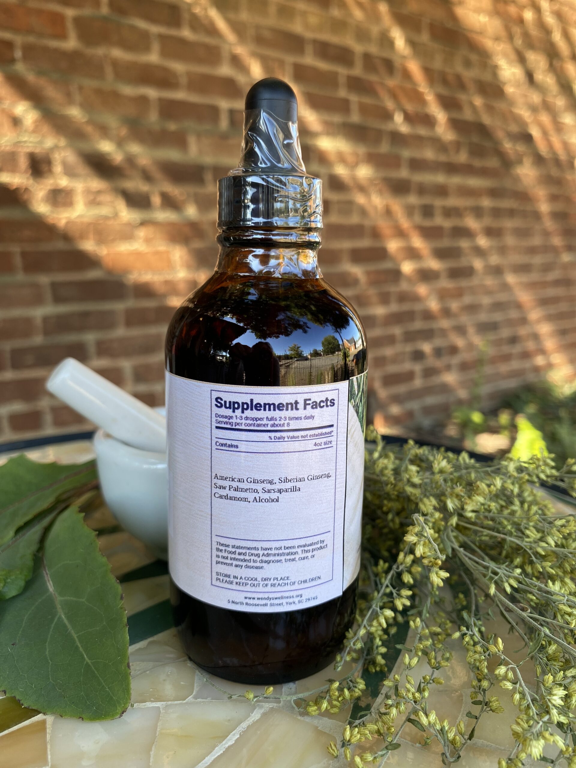 Contains:  American Ginseng, Siberian Ginseng, Saw Palmetto, Cardamon Seed, Sarsaparilla, Alcohol